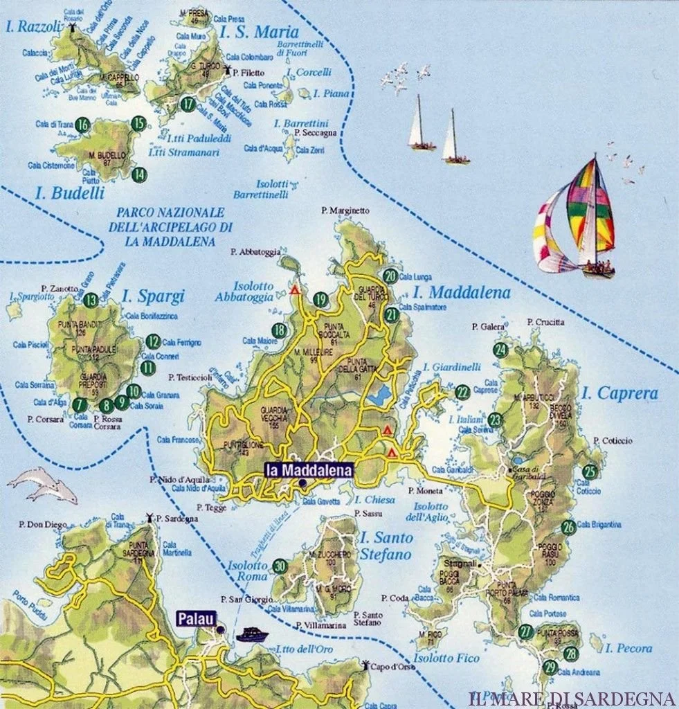 The archipelago of La Maddalena (once also called the "Intermediate Islands"), consists of a group of 7 main islands (La Maddalena, Caprera, Santo Stefano, Budelli, Santa Maria, Razzoli and Spargi) and 15 smaller ones, as well to an infinity of islets and rocks.